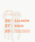 Salmón fresco 20% (aporta ácidos grasos omega-3 EPA +DHA), carne, huesos carnosos y vísceras frescas de pavo 57%