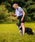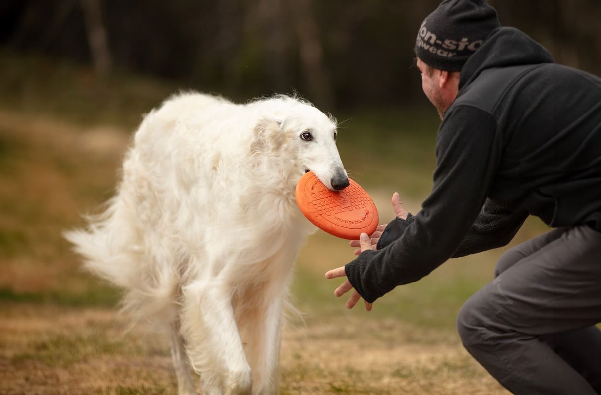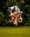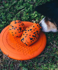 Lánzalo a corta o media distancia y deja que lo atrape al vuelo. Revisa siempre el juguete tras su uso y no lo dejes como mordedor sin supervisión.