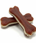 Mordedor tipo hueso (10 cm) con núcleo de rawhide y revestimiento/relleno de pato suave. Empieza crujiente y pasa a masticable, alargando la sesión y aportando entretenimiento y fricción dental ligera. 60% proteína, solo 2% grasa, sin azúcar añadido.