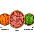 Pavo fresco 63%, calabaza 4%, espinacas 1%, minerales y aceite de pescado.