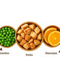 Pollo fresco 65%, guisantes 4%, naranja y minerales.