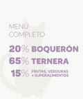 Boquerones frescos 20% (aportan ácidos grasos omega-3 EPA +DHA), Carne, huesos carnosos y vísceras frescas de ternera 65%, boniato fresco 5%, calabaza fresca 5%, zanahoria fresca 1%, manzana fresca 1%, arándanos frescos <1%,Fórmula SUPERFoodComplete 6000mg/kg(minerales naturales (aportan oligoelementos esenciales),raíz de Achicoria (Cichorium intybus, fuente natural de inulina),cúrcuma longa (fuente natural de antioxidantes),alga kelp (Ascophyllum nodosum, aporte natural de minerales y yodo),espirulina (Arthrospira platensis, fuente natural de carotenoides),mejillón de labio verde (Perna canaliculus, aporte natural de glucosamina y condroitina), Bacillus coagulans (probiótico que favorece lamicrobiota intestinal)),Fórmula SUPERFood Cat specific 9000mg/kg(taurina (aminoácido esencial), levadura de cerveza (Saccharomyces cerevisiae, fuente natural de MOS y vitaminas del grupo B), cáscara de psyllium (Plantago ovata, fuente natural de fibra soluble)), glicerina de origen vegetal (ayuda a mantener la humedad),Antioxidantes naturales:tocoferoles naturales 100mg/kg (fuente de vitamina E), extracto natural de romero (rosmarinus officinalis).
